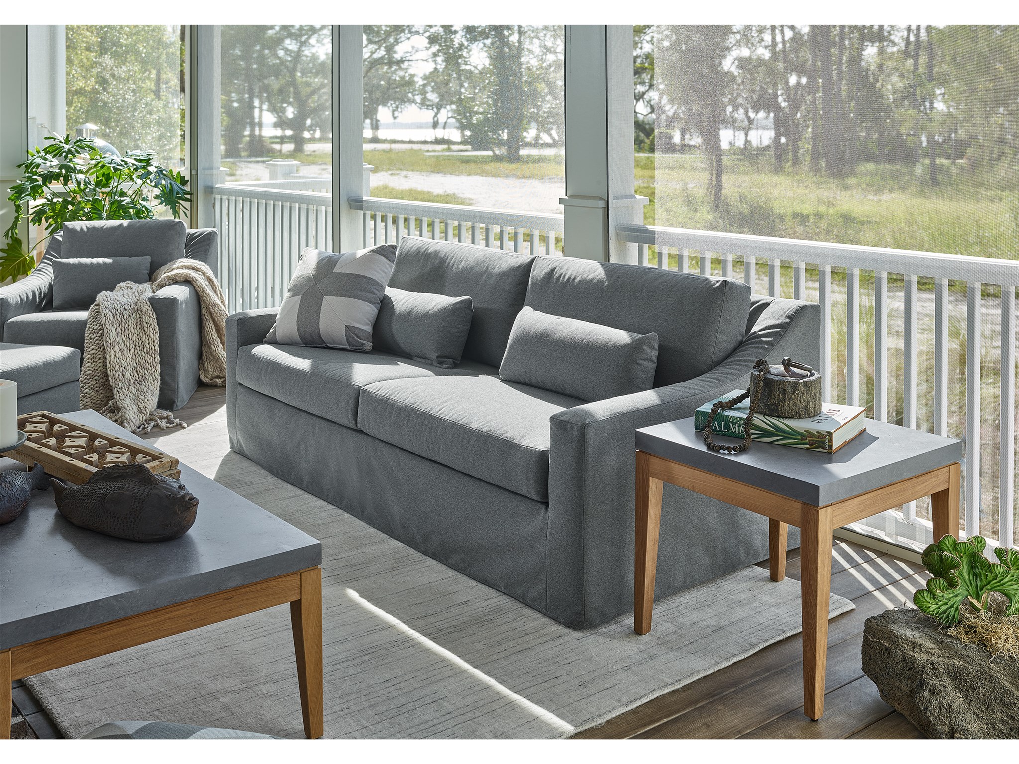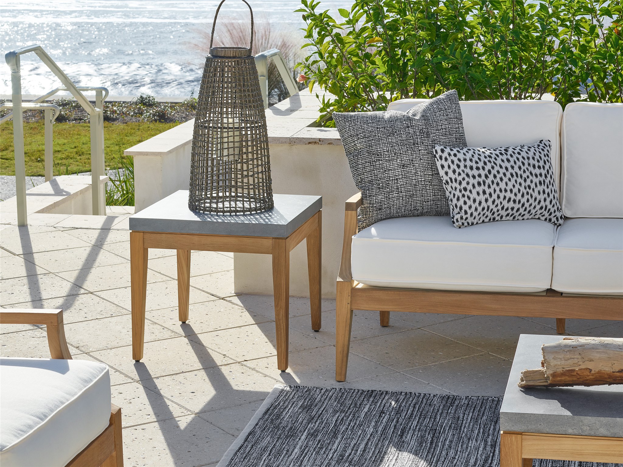 Coastal Living Outdoor Chesapeake End Table Perfect outdoor living spaces with the Chesapeake End Table, showcasing a smooth gray stone top which is offset by a natural wooden base.Coastal Living OutdoorOutdoorEnd TablesOutdoorU012815