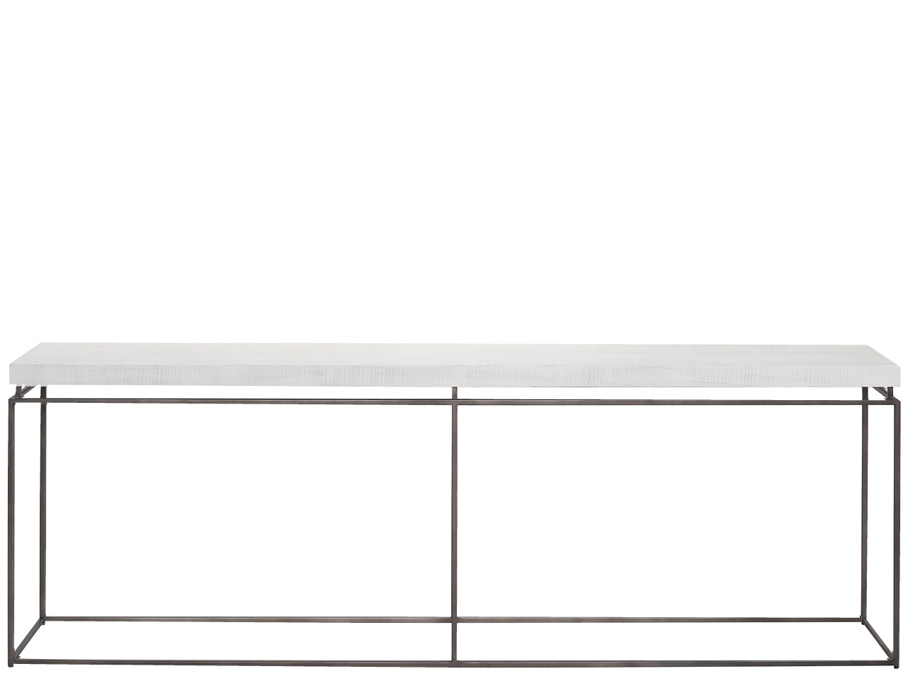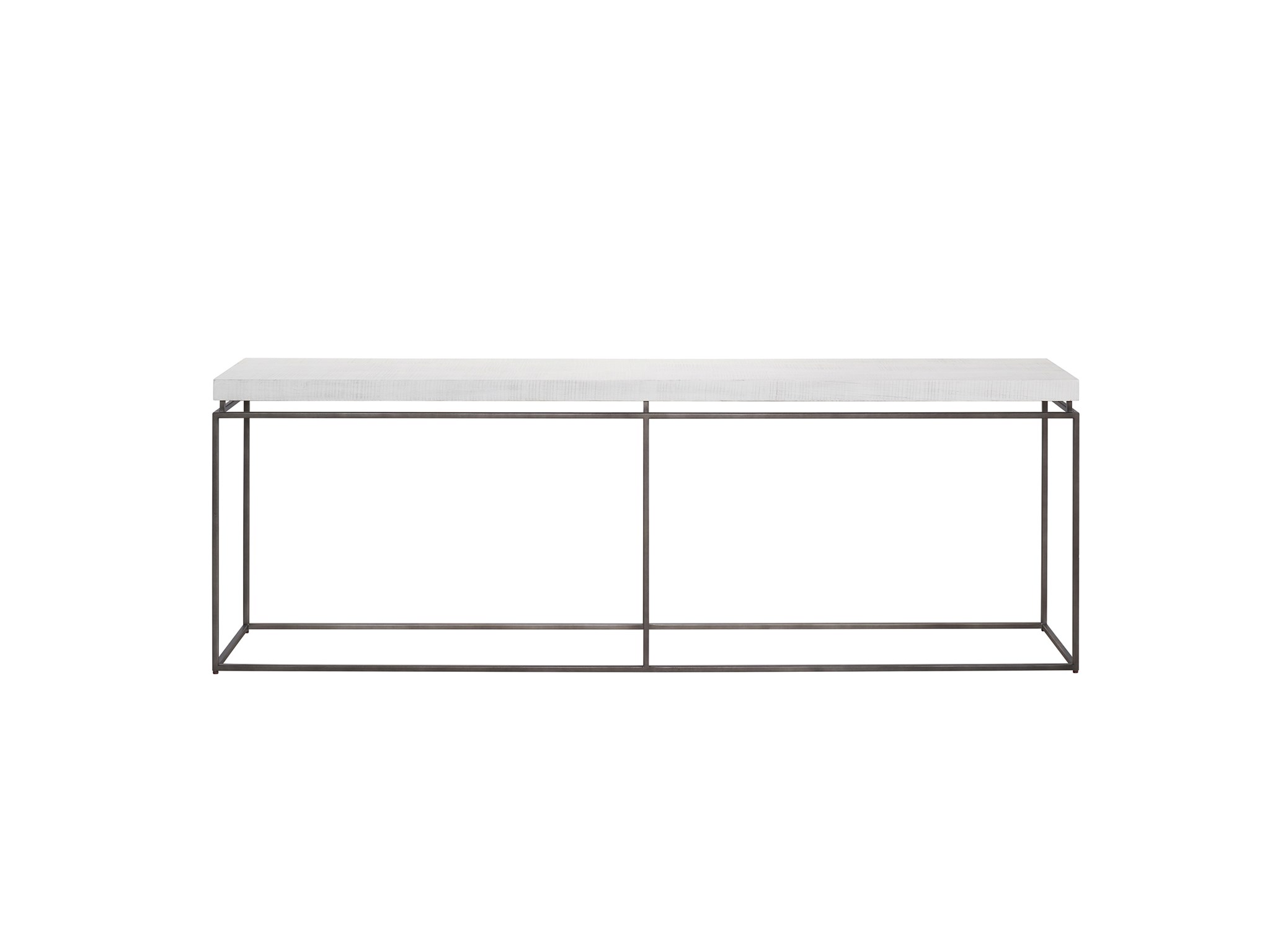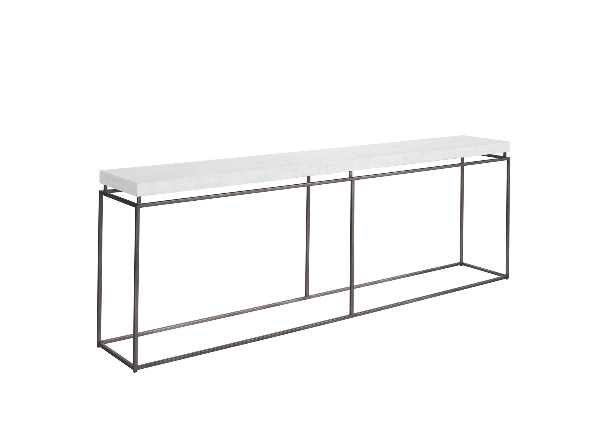 Modern Farmhouse Watts Console TableBoasting a chic and narrow silhouette, the Console Table showcases a perfect blend of modern farmhouse style with a crisp white tabletop set atop a sleek metal base.Modern FarmhouseAccent TablesConsolesLiving RoomU011A826
